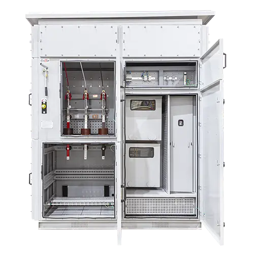 Este cubículo de média tensão fixo conta com os seguintes compartimentos: barramentos, seccionamento e comando.